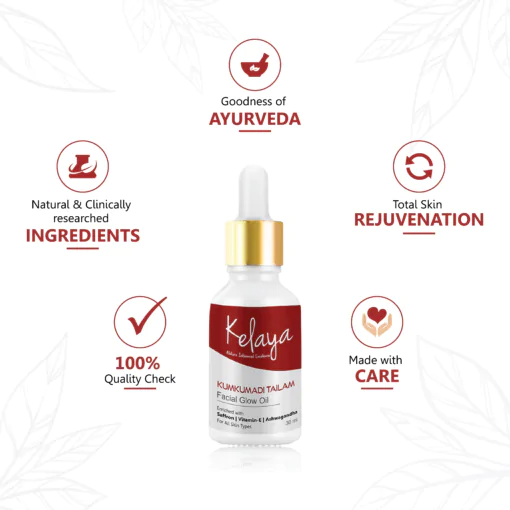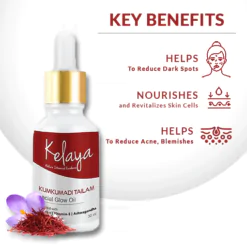 Kumkumadi Oil is enriched with anti-inflammatory, and anti-bacterial properties that aid with skin acne and pimples. It works to cleanse pores, excess oil, dirt, or dead skin cells.