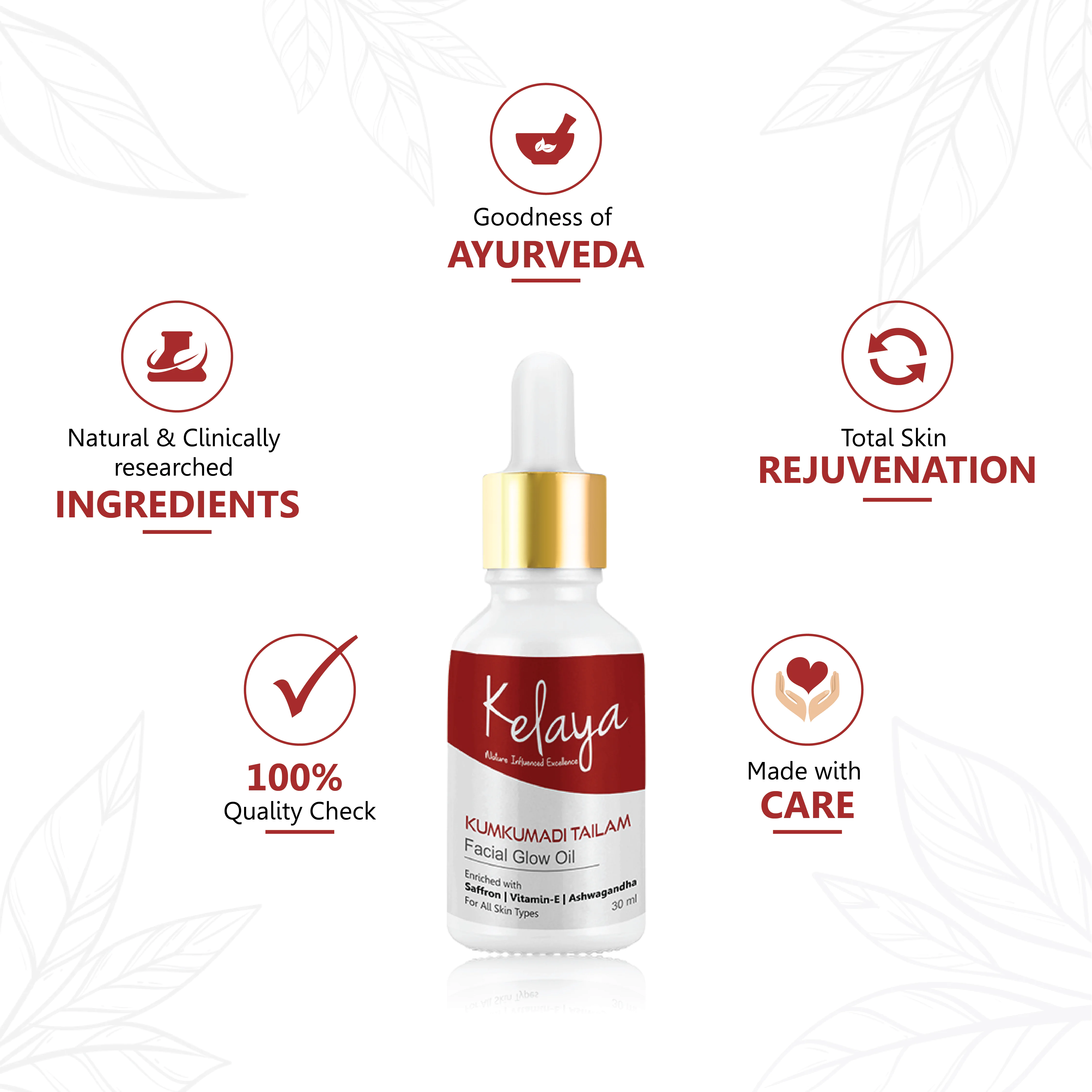With the goodness of Ayurveda, our face oil is a traditional beauty recipe with clinically proven ingredients. It is formulated from a natural extraction process for natural beauty benefits.